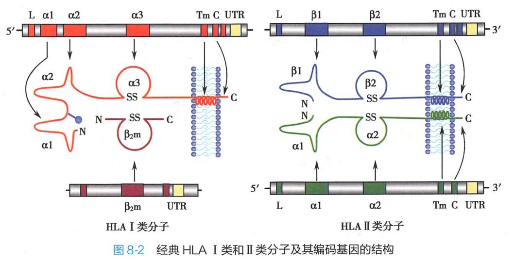 经典的HLAI类基因座集中在远离着丝粒的一端,按序包括BCA三个座位(图8-1),产物称为HLAI类分子。I类基因仅编码I类分子异二聚体中的重链,轻链又名 β微球蛋白(B,microglobulin, B,m),由第15号染色体上的基因编码。经典的HLAⅡ类基因座在复合体中靠近着丝粒一侧,依次由DP、DQ和DR三个亚区组成。每一亚区又包括A和B两种功能基因座位(图8-1)分别编码分子量相近的HLAⅡ类分子的α链和β链,形成a/β异二聚体蛋白(DPα/DPβ、DQα/DQβ和 DRα/DRβ)。每个MHC基因均含有多个外显子,分别编码 MHC分子的胞外区跨膜区和胞质区。外显子上MHC 分子的对应关系如图 8-2。
