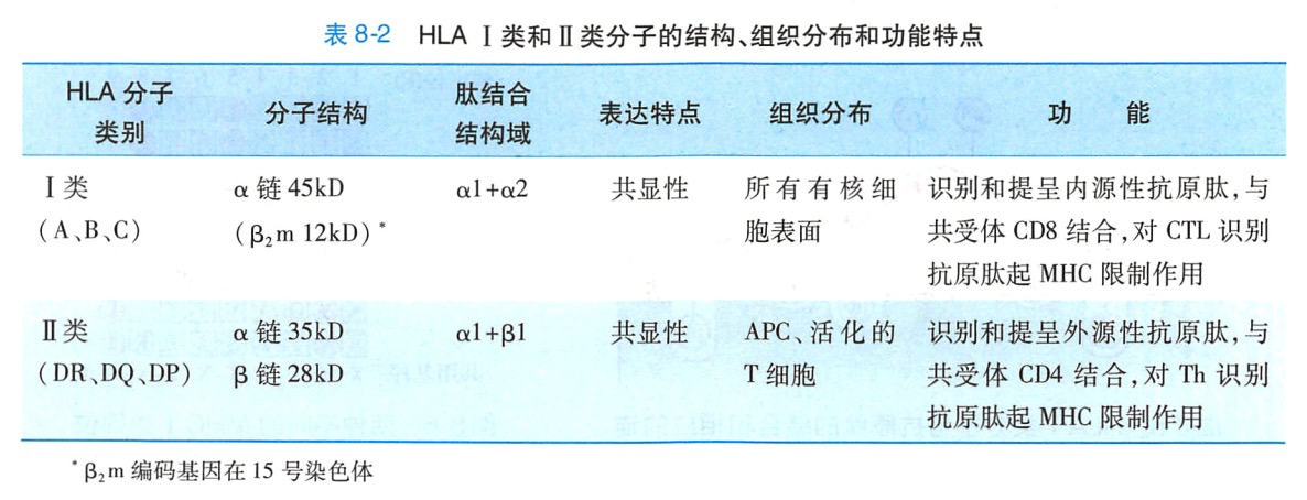 经典的HLAI类分子和Ⅱ类分子在组织分布、结构和功能上各有特点(表8-2)。