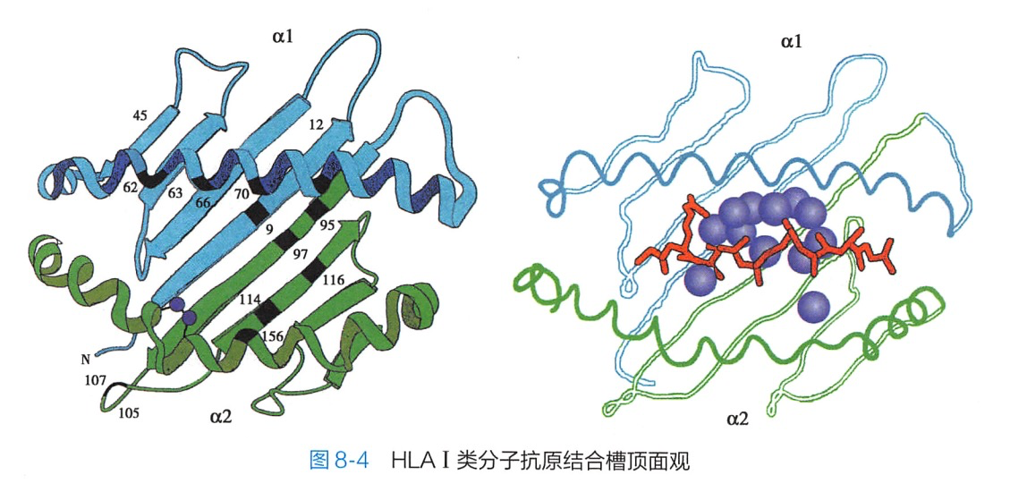 I类分子重链(α链)胞外段有3个结构域(a1、a2、a3),远膜端的2个结构域a1和a2构成抗原结合槽。I类分子的抗原结合槽两端封闭,接纳的抗原肽长度有限,为8~10个氨基酸残基(图8-2、图 8-4)。