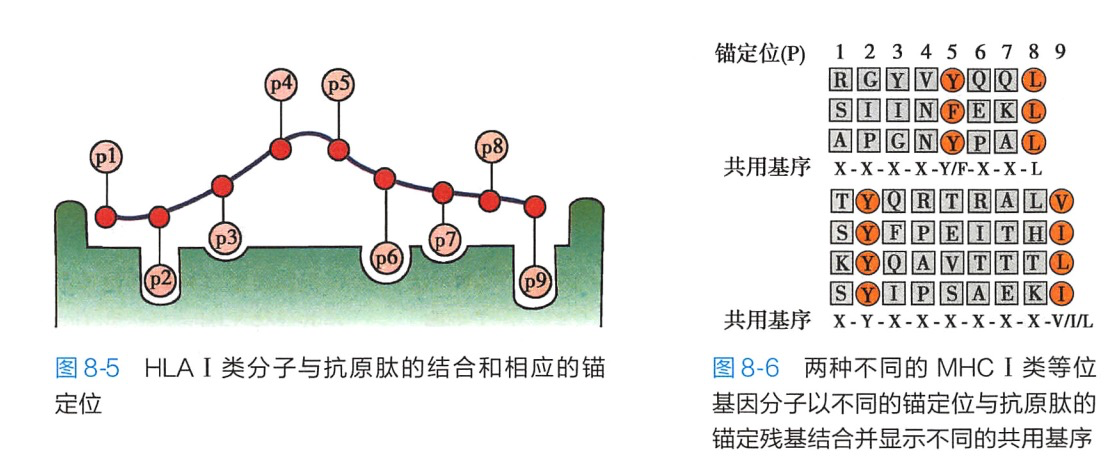 MHC 分子结合并提呈抗原肽供 TCR 识别。MHC的抗原结合槽与抗原肽互补结合,其中有两个或两个以上与抗原肽结合的关键部位.称锚定位(anchor position.pocket)(图8-5)。抗原肽与该位置结合的氨基酸残基称为锚定残基(anchor residue)。锚定位与锚定残基是否吻合决定 MHC的抗原结合槽与抗原肽结合的牢固程度。以MHCI类分子结合9肽抗原为例(图8-6):9肽的锚定位在p2(锚定残基Y)和p9(锚定残基V、I或L)。