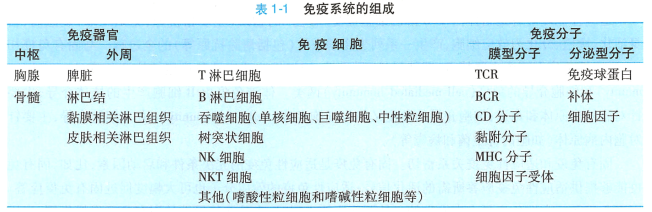 免疫力(即免疫功能)是由机体的免疫系统来执行的,免疫系统包括免疫器官、免疫细胞和免疫 分子(表1-1) 。 本书的第二章至第十一章(除第三章抗原外)以及第十四章分别介绍了免疫组织和器 官重要的免疫分子和免疫细胞。