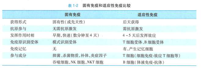免疫系统将入侵的病原微生物以及机体内突变的细胞和衰老、死亡细胞认为是“非己"的物质。 免疫应答( immune response) 是指免疫系统识别和清除“非己“物质的整个过程,可分为固有免疫 (innate immunity) 和适应性免疫(adaptive i mmunity) 两大类(表1 -2) 。 固有免疫又称先天性免疫 (natural immunity or native immunity) 或非特异性免疫(non-specific immunity) , 适应性免疫又称获得性 免疫(acquired immuni ty) 或特异性免疫(specific immunity) 。