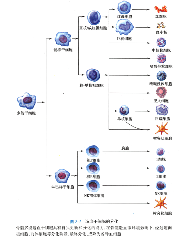 1. 各类血细胞和免疫细胞发生的场所 在骨髓造血诱导微环境中,HSC 最初分化为定向干细胞,包括髓样干细胞(myeloid stem cell ) 和淋巴样千细胞( lymphoid stem cell ) 。 髓样干细胞最终分化为粒细胞、单核细胞、红细胞和血小板等。 淋巴样干细胞分化为祖B 细胞(pro-B cell) 和祖T 细胞(pro-T cell) 。 祖B 细胞在骨髓中继续分化为成熟B 细胞;祖T 细胞则经血液循环迁移至胸腺,在胸腺微环境诱导下进一步分化为成熟T 细胞。 成熟的B 细胞、T 细胞离开骨髓或胸腺,经血循环迁移并定居于外 周免疫器官。 尚未接触过抗原的成熟T、 B 细胞被称为初始淋巴细胞(naive lymphocyte) 。 树突状细胞来自髓样干细胞和淋巴样干细胞(图2-2) 。