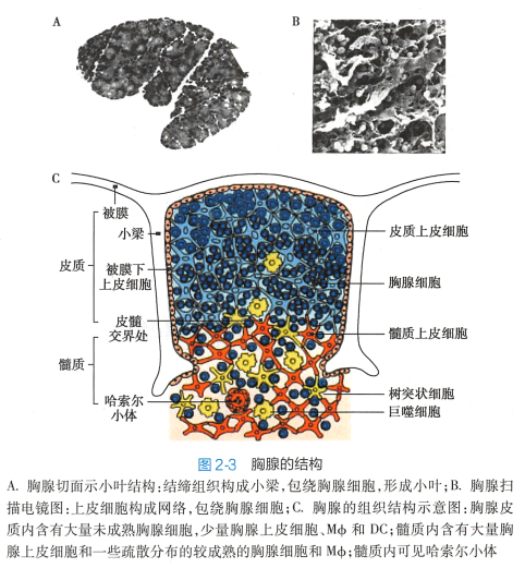 胸腺(thymus) 是T 细胞分化、发育、成熟的场所。 老年期胸腺明显缩小,皮质和髓质被脂肪组织取代,胸腺微环境改变,T 细胞发育成熟减少,导致老年人的免疫功能减退。