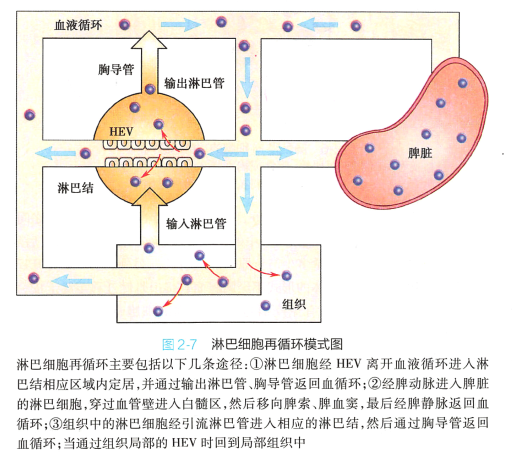 淋巴细胞再循环( lymphocyte recirculation) 指定居在外周免疫器官的淋巴细胞,由输出淋巴管经 淋巴干、胸导管或右淋巴导管进入血液循环,经血液循环到达外周免疫器官后,穿越HEV,重新分布 于全身淋巴器官和组织的反复循环过程(图2-7 ) 。 参与再循环的淋巴细胞主要是T 细胞,约占80% 以上,其次为B 细胞。