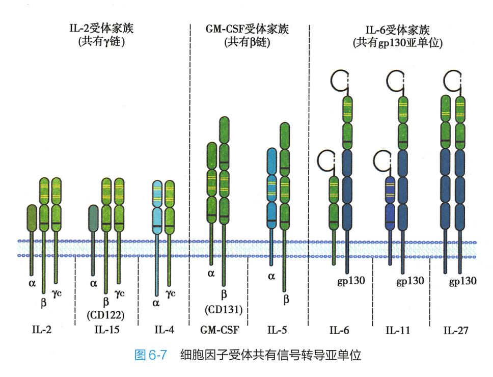 大多数细胞因子受体由2条或3条多肽链构成,其中1条(或2条)多肽链特异性结合细胞因子,称为细胞因子结合亚单位;另一条多肽链则转导信号,称为信号转导亚单位。结合亚单位构成低亲和力受体,信号转导亚单位一般不能单独与细胞因子结合,但与结合亚单位共同构成高亲和力受体并转导信号。在细胞因子受体中,信号转导亚单位常可共用,称为细胞因子受体共有链(common chain, c),现已发现共有γ 链(common γ chain.γ c)、共有β链(βc)和gp130(图6-7)。例如IL-2 IL-4、1L-7、1L-9、1L-15 和IL-21 受体中有γ c链;IL-3、IL-5、GM-CSF 受体中有 βc 链;IL-6、IL-11、IL-27 受体中有相同的gp130链。