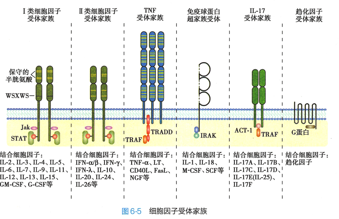 细胞因子受体根据其结构特点被分为以下六个家族(图6-5) 。