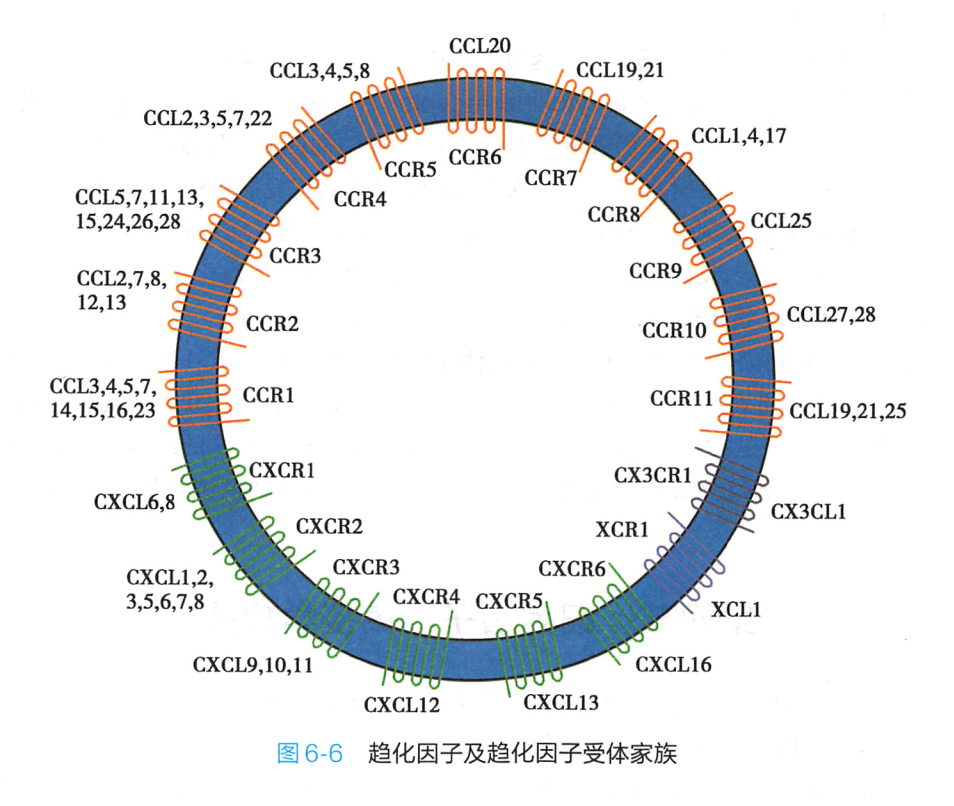 6.趋化因子受体家族(chemokine receptor family)也称7次跨膜受体家族,属于G蛋白偶联受体超家族。趋化因子受体命名的规则是在趋化因子可家族名称后缀以R(receptor),再按受体被发现的顺序缀以阿拉伯数字进一步区分。例如与 CXCL 化因子结合的受体共有6种,分别命名为CXCR1~CXCR6;CCL趋化因子受体共有11种,分别命名为 CCR1~CCRI1。少数趋化因子受体仅与一种配体结合,为特异性趋化因子受体,如 CXCR4 仅能结合 CXCL12。多数情况下,一种趋化因子受体可结合多个配体,一种配体也可与多个受体结合,为共享性趋化因子受体(图 6-6)。