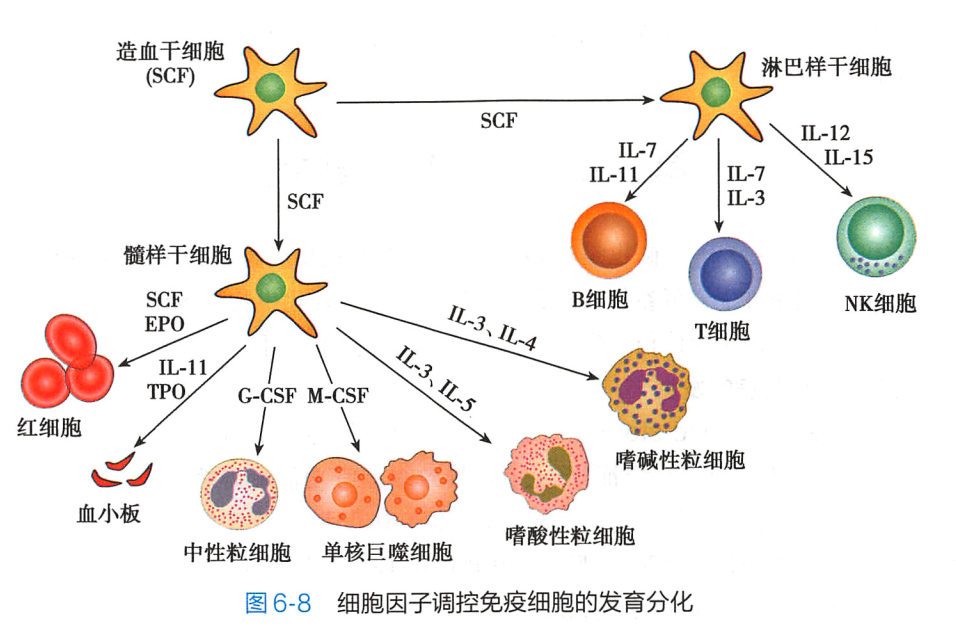 调控免疫细胞在中枢免疫器官的发育、分化 骨髓多能造血干细胞 (HSC) 发育分化为不同谱系的免疫细胞的过程受到骨髓基质细胞分泌的多种细胞因子调控 (IL-7、SCF、CXCL12 等) 。 胸腺微环境中产生的细胞因子对调控造血细胞和免疫细胞的增殖和分化亦起着关键作用(图 6-8) 。