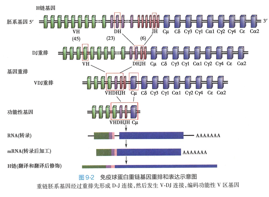 通过重组酶的作用,可以从众多的V(D)J基因片段中各选择1个V片段,1个D片段(轻链无D片段)和1个J片段重排在一起,形成V(D)J连接(图9-2),最终表达为有功能的BCR。Ig胚系基因重排的发生具有明显的程序化,首先是重链可变区发生基因重排,随后是轻链重排。经过Ig 胚系基因的重排,B细胞的DNA序列与其他体细胞有很大不同,这是存在于B细胞和T细胞中独特的生物学现象。