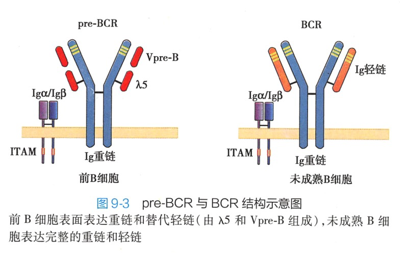 2.前B细胞 前B细胞的特征是表达前B细胞受体(pre-BCR)(图9-3),并经历大pre-B和小 pre-B两个阶段。pre-BCR由μ链和替代轻链(surrogate light chain,包括分别与轻链V区和C区同源的VpreB和λ5两种蛋白)组成,可抑制另一条重链基因的重排(等位基因排斥),促进B细胞的增殖。大pre-B细胞进一步发育成为小pre-B细胞,小pre-B细胞开始发生轻链基因V-J重排,但依然不能表达功能性 BCR。