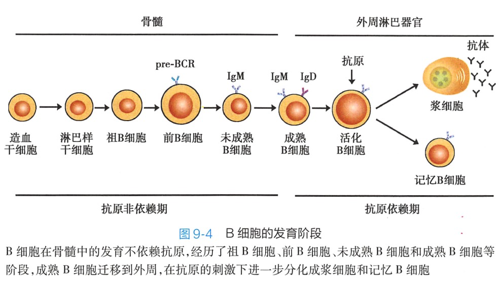 B细胞在骨髓中的发育经历了祖B细胞(pro-Bcell)、前B细胞(pre-Bcell)、未成熟B细胞(im mature B cell)和成熟B细胞(mature Bcell)等几个阶段。