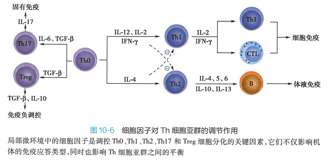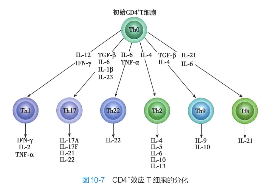 Th均表达CD4通常所称的 CD4T细胞即指 Th。未受抗原刺激的初始CD4T细胞为Th0。ThO向不同谱系的分化受抗原的性质和细胞因子等因素的调控,而最重要的影响因素是细胞因子的种类和细胞因子之间的平衡(图10-6)。例如.胞内病原体和肿瘤抗原以及IL-12、IFN-γ诱导Th0向Thl分化,其中IL-12 主要由 APC产生;普通细菌和可溶性抗原以及 IL-4 诱导 ThO 向 Th2分化,其中IL-4主要由局部环境中NKT细胞以及嗜酸性粒细胞和嗜碱性粒细胞等所产生;TGF-β和IL-4诱导Th0向 Th9分化;TGF-β和IL-6 诱导 Th0 分化为Th17;IL-6和TNF-α诱导 Th0分化为Th22;IL-21和IL-6诱导Th0分化为Tfh(图10-7)。除细胞因子外,APC表达的共刺激分子对Th0的分化方向亦发挥调节作用。例如,ICOS 可促进 Th2 的分化,而4-1BB与Th1 的分化有关。
