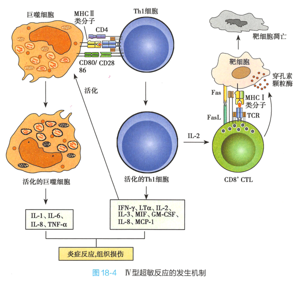 抗原激活的效应Th1细胞释放多种细胞因子如IFN-γ 、 TNF-α、 LT-α(TNF-β) 和趋化因子MCP-1等。 TNF-α 和LT-α使局部血管内皮细胞黏附分子的表达增加,MCP-1 趋化单个核细胞,促进巨噬细胞和淋巴细胞至抗原部位聚集,引起组织损伤;IFN-γ 和TNF-a 可使巨噬细胞活化,进一步释放促炎细胞因子IL-1 和IL-6 等加重炎症反应。 Th1 细胞还可借助FasL 杀伤表达Fas 的靶细胞。 抗原激活的Th17 细胞产生的IL-17 可募集单核细胞和中性粒细胞到达抗原部位参与组织损伤(图18-4) 。 (二) CTL介导的细胞毒作用