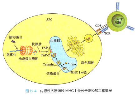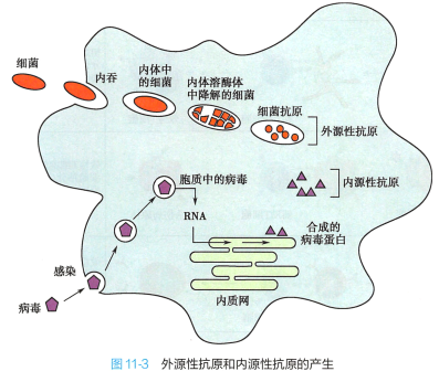 根据来源不同可将被提呈的抗原分为两大类(图11-3) :1)来自细胞外的抗原称为外源性抗原 (exogenous antigen) , 例如被吞噬的细胞、 细菌或蛋白质抗原等; 2)细胞内合成的抗原称为内源性抗原 (endogenous antigen) , 例如病毒感染细胞内合成的病毒蛋白、肿瘤细胞内合成的肿瘤抗原和某些细胞 内的自身抗原等。