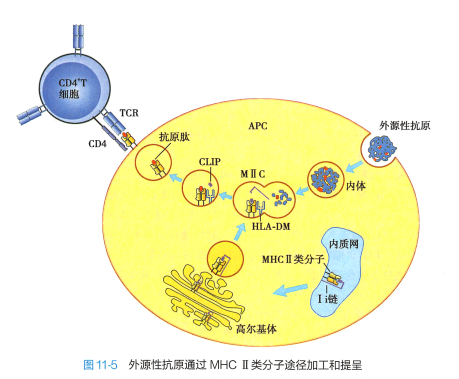 外源性抗原主要通过MHCII 类分子途径加工与提呈(图11-5) 。