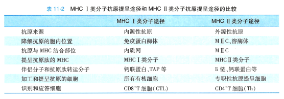 根据抗原的性质和来源不同,APC 通过四种途径进行抗原的加工和提呈:MHC I 类分子途径(内源性抗原提呈途径或胞质溶胶抗原提呈途径)、MHCII 类分子途径(外源性抗原提呈途径或溶酶体抗原提呈途径)、非经典的抗原提呈途径(MHC 分子对抗原的交叉提呈途径)、脂类抗原的CDI 分子提 呈途径。 表11-2 归纳了MHC I 类分子途径和MHCII 类分子途径的差别。