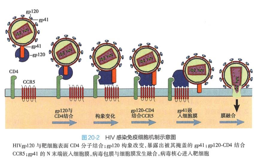 1.HIV感染免疫细胞的机制HIV主要侵犯宿主的CD4*细胞(T细胞、单核/巨噬细胞、DC和神经胶质细胞等)。HIV通可工外膜精蛋白 m120与靶细胞膜表面 CD4分子结合 导致病毒脆蛋白变构,暴露新的位点与靶细胞膜表面的趋化因子受体CXCR4(T细胞)或CCR5(巨噬细胞或DC)结合导致gp120构象改变,暴露出被其掩盖的gp41。gp41的N末端疏水序列(融合肽)直接插入靶细胞膜,介导病毒包膜与细胞膜融合,使病毒核衣壳进入靶细胞(图20-2)。
