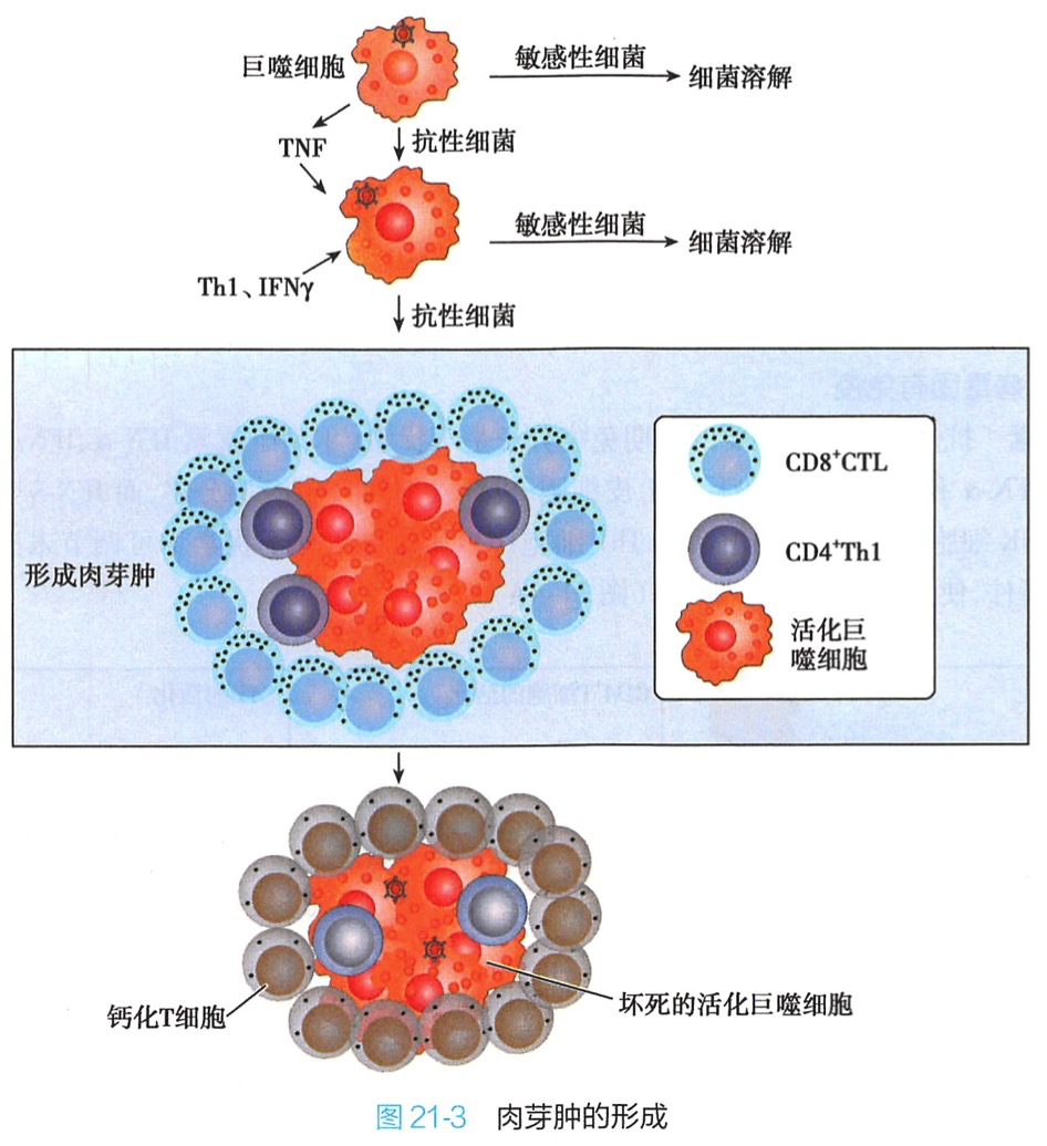 当宿主抗胞内菌免疫与病原体的博弈相持不下、而转为慢性感染时,就会在宿主感染局部形成一种称为肉芽肿的结构以局限化感染。肉芽肿的内层包含巨噬细胞和CD4+T细胞,而外层是CD8+T细胞。部分肉芽肿的外层钙化、纤维化、中间的细胞坏死,死亡细胞中的所有病原体都被杀灭,感染被消除;少数病原体仍然存活并在肉芽肿中休眠,如果肉芽肿破裂,病原体就会被释放,重新开始增殖。如果宿主的免疫应答处于免疫抑制状态,无法聚集抵抗新一次攻击所必需的T细胞和巨噬细胞,病原体可能进入血液,进一步感染全身的组织,甚至导致死亡。