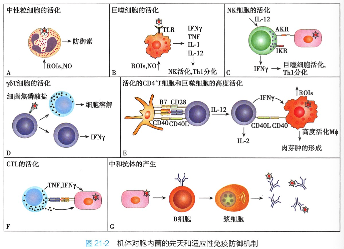 1.中性粒细胞和巨噬细胞的作用 最早到达感染局部的是中性粒细胞。中性粒细胞分泌防御素破坏尚未进入宿主细胞的胞内菌,从而控制早期感染;有些细菌虽然逃脱了防御素的破坏,随之可被中性粒细胞吞噬后通过强大的呼吸爆发杀灭。活化的巨噬细胞在吞噬及杀灭胞内菌的过程中起着重要作用。巨噬细胞还通过TLR对分枝杆菌的脂蛋白和脂多糖识别,活化产生促炎细胞因子,促进NK细胞活化和Th1细胞分化,进而杀灭细菌。