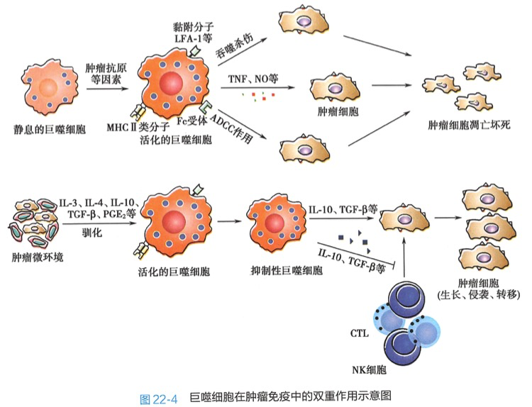 (2)巨噬细胞的抗肿瘤作用:巨噬细胞在肿瘤免疫中具有双重作用。一方面,巨噬细胞作为专职性APC 通过提呈肿瘤抗原诱导特异性抗肿瘤免疫应答,活化巨噬细胞可非特异吞噬,或通过ADCC杀伤肿瘤细胞,还可通过分泌TNF、NO等细胞毒性因子间接杀伤肿瘤细胞。另一方面,巨噬细胞可被肿瘤细胞分泌的某些因子驯化,成为免疫抑制性肿瘤相关巨噬细胞(TAM),能促进肿瘤的发展。