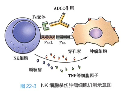 (1)NK细胞的抗肿瘤作用:NK细胞是早期抗肿瘤的重要细胞,是抗肿瘤的第一道防线。NK细胞在趋化因子作用下迁移至肿瘤局部。由于突变细胞或肿瘤细胞表面的 MHCI类分子缺失或降低,不能与 NK 细胞表面的抑制性受体(killer inhibitory receptor,KIR)结合,不启动杀伤抑制信号;但其表面糖类配体可与NK表面的活化性受体(killer activation receptor,KAR)结合,从而激活 NK 细胞并发挥杀伤效应。NK 细胞可通过四种方式杀伤靶细胞,包括 ADCC、Fas/FasL途径、穿孔素-颗粒酶途径和通过释放 TNF 等细胞因子杀伤靶细胞。