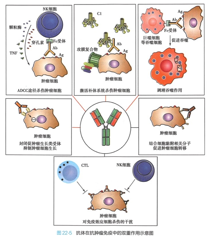 1.抗体在抗肿瘤免疫中的作用 肿瘤细胞因表达肿瘤抗原而能激活B细胞分泌具有抗肿瘤作用的抗体。这些抗体可通讨如下机制发挥抗肿瘤作用:1)激活补体系统溶解肿瘤细胞;2) IgG可介导巨噬细胞、NK细胞发挥ADCC效应;3)抗体的调理吞噬作用;4)抗体封闭肿瘤细胞上的某些受体,如封闭肿瘤细胞表面转铁蛋白受体,抑制肿瘤细胞生长。