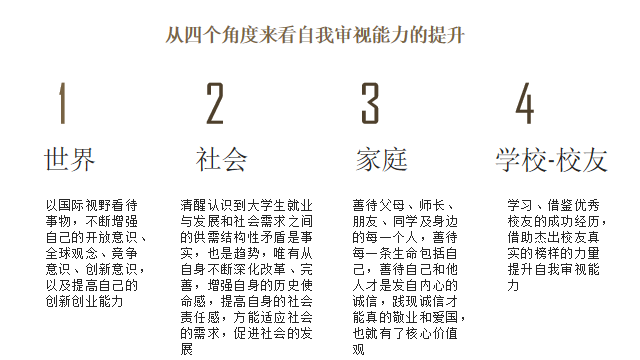 当理想我与现实我趋于统一,主观我与客观我趋于一致时,人们对自我的认识会更加深刻、客观、理性。大学生积极地自我审视和认知,不仅可以了解自己的长处与优势,还可以了解自己的不足与劣势,从而能够分析哪些目标是自己通过努力可以达到的、哪些目标是属于无法企及的,在此基础上才能找到自己人生的目标和方向,帮助自己向着理想迈进。