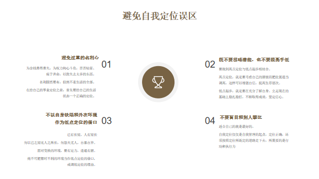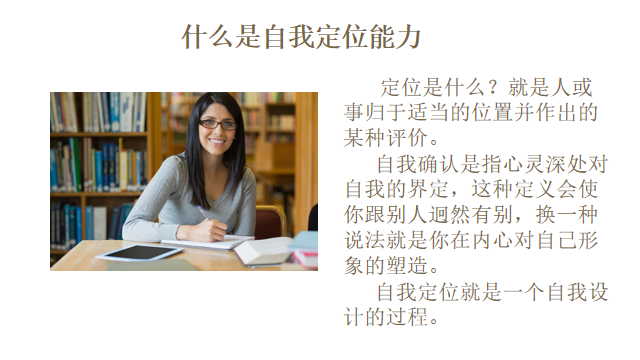 提高自我定位能力,要从社会现实与发展趋势、自身现状与成才要求两方面入手,将自身的专业知识、技术能力、兴趣爱好特长、心态稳定和心理成熟程度等置于所处的环境,本着实事求是和与时俱进的原则,不断清晰阶段性坐标位置,矫正长期性目标轨迹。位明则事成,位不明事不成。