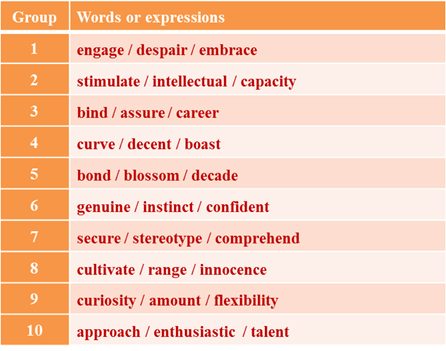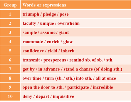 Work in groups to make word-posters using Powerpoint. Each group is assigned 3 words or expressions which are included in Unit 1 (both Section A and B). Each word or expression takes just one ppt page. Try to make your examples and pictures helpful in explaining the meaning of the target words or expressions.
