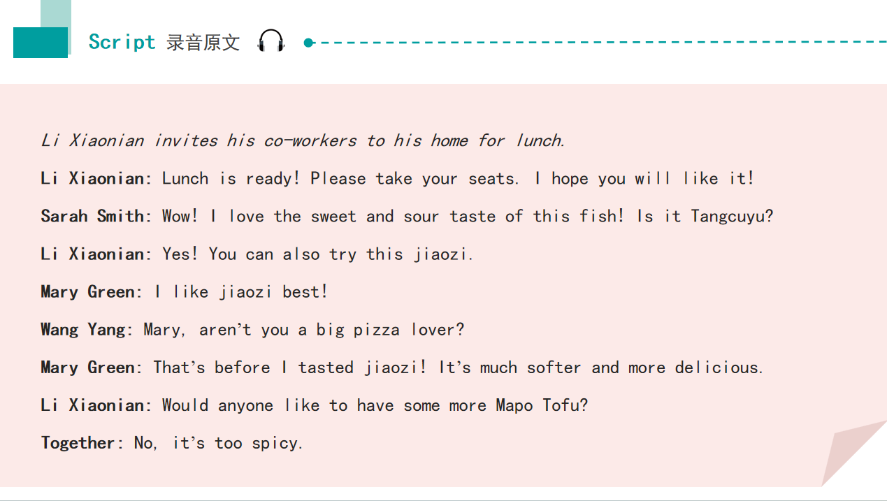 (2) 以小组进行汇报,选择喜欢的食物,描述其口味以及对该食物的喜好。如:Pudding is sweet. I like it very much. /Mapo Tofu is too spicy. Ican’t stand it.