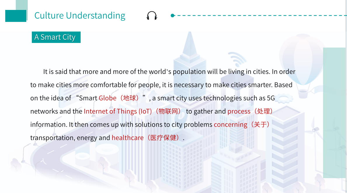 We are doing a survey about the smart city. 我们正在做一个关于智慧城市的调研。