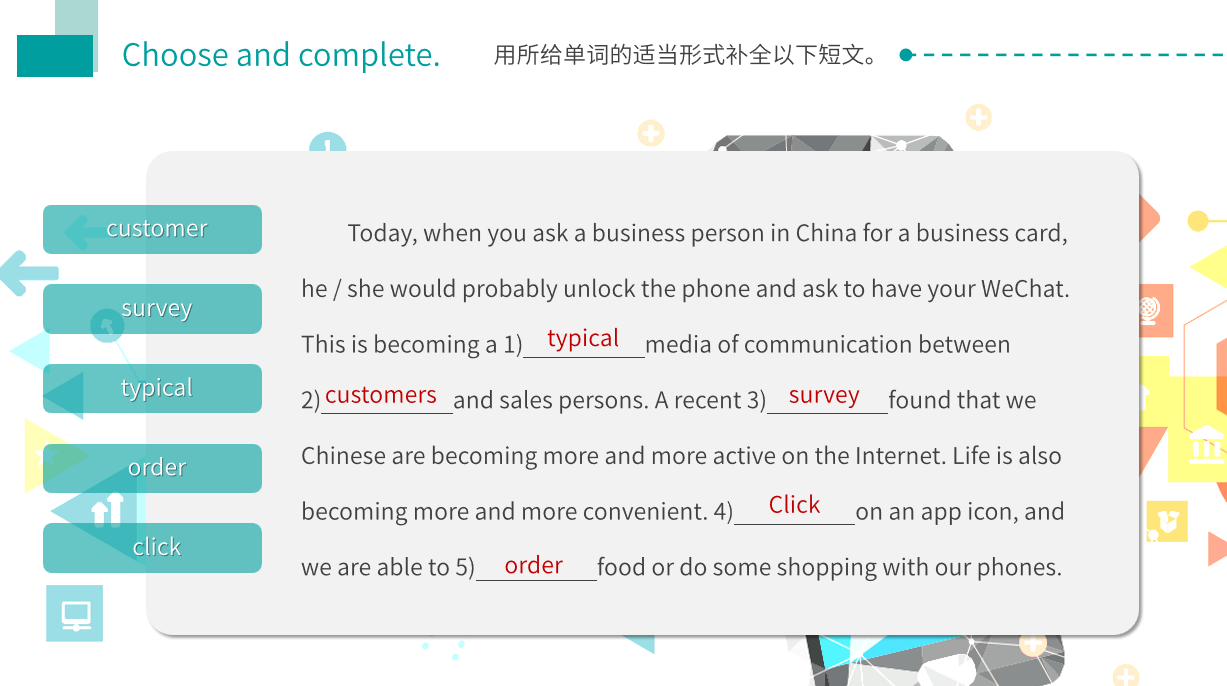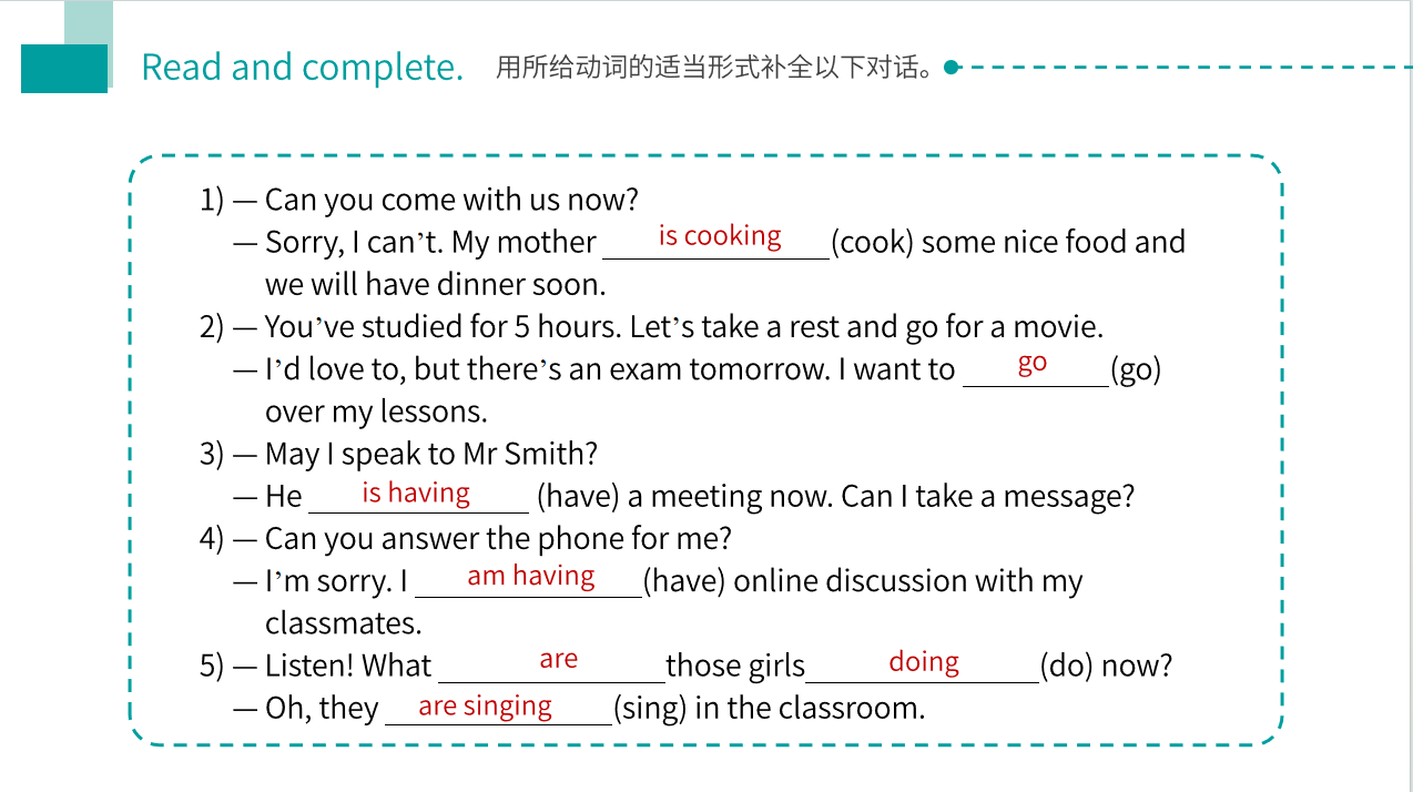 (2)总结与现在进行时相匹配的时间状语(教师可以做必要的补充),如:now,at this / the moment,look,listen。
