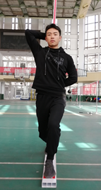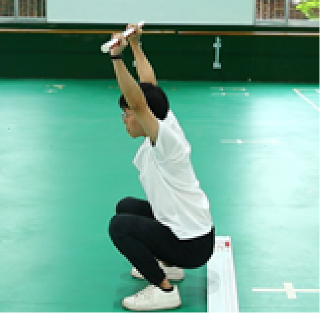 3.保持面向前抬头挺胸,杆保持在头顶以上;允许试三次,如果还是不能完成这个动作,在运动员的双足跟下各垫5cm厚的扳子再完成以上动作。