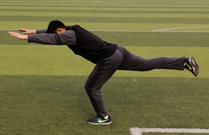 直腿硬拉走是一个很好的主动腘绳肌拉伸练习。此外,它为脚踝的肌肉提供了极好的本体刺激。双臂量向前伸,同时尝试将一条腿抬到腰部的高度(图6)。这个动作为支撑腿的眶绳肌提供了极好的动态拉伸,同时激活对侧腿的腘绳肌作为髋部伸肌,注意身体的延展性。