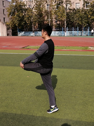 正如前面的练习那样,将脚后跟拉到臀部。同时身体向前倾,躯干保持挺直,并尽量抬高膝盖(图4)。该练习刺激了抬起腿的股四头肌和股直肌,同时给支撑脚和脚踝提供了很好的本体感觉。