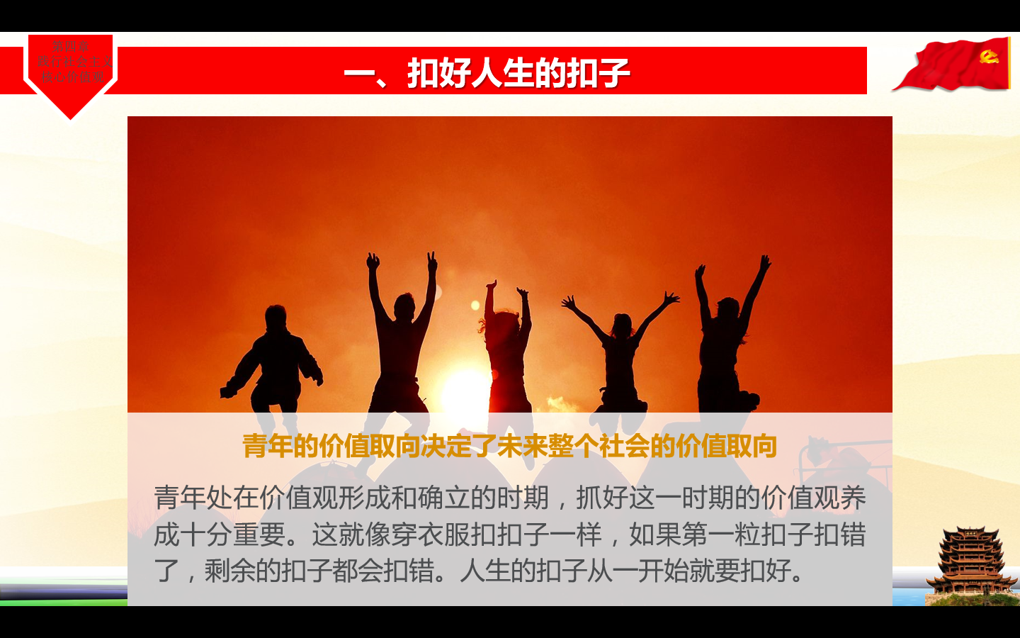 2014年5月4日《习近平在北京大学师生座谈会上的重要讲话》:青年的价值取向决定了未来整个社会的价值取向,而青年又处在价值观形成和确立的时期,抓好这一时期的价值观养成十分重要。这就像穿衣服扣扣子一样,如果第一粒扣子扣错了,剩余的扣子都会扣错。人生的扣子从一开始就要扣好。
