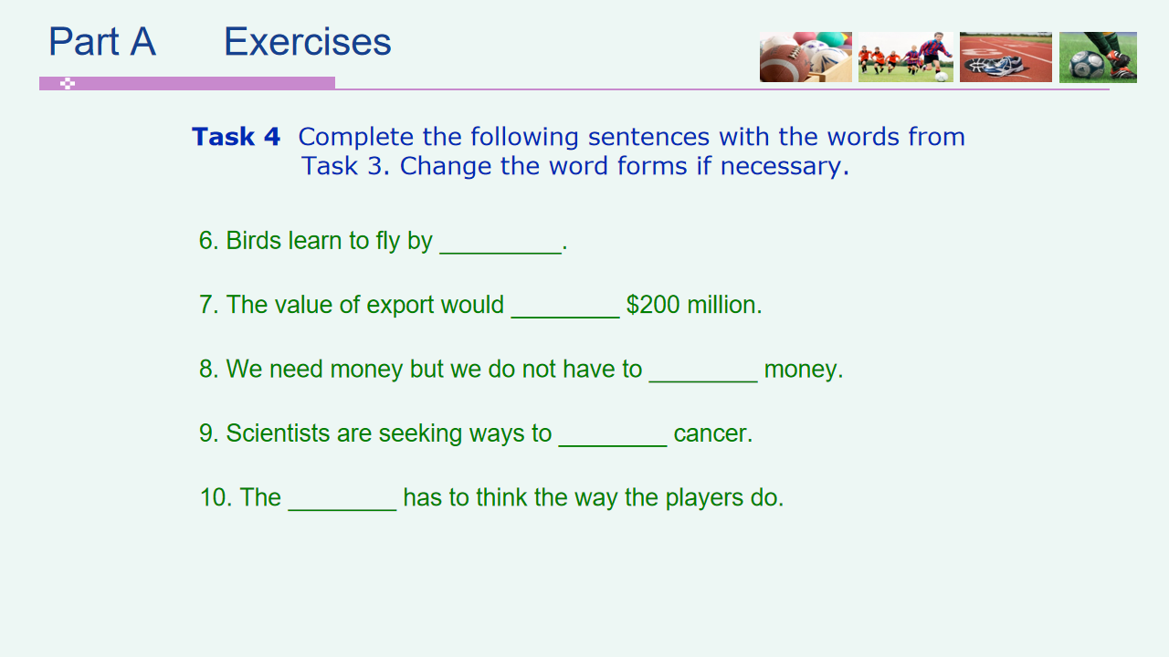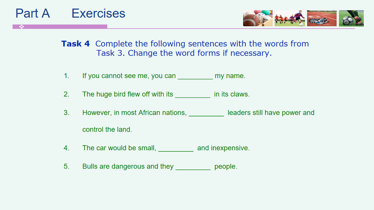 Task 4 Complete the following sentences with the words from Task 3. Change the word forms if necessary.