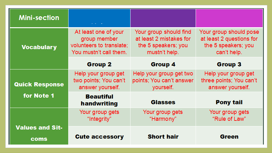 Three students are chosen to be spies and are assigned with one mission for each mini- section. If one spy fails in one mini-section, one clue about him or her will be revealed.Two students will be chosen as judges.