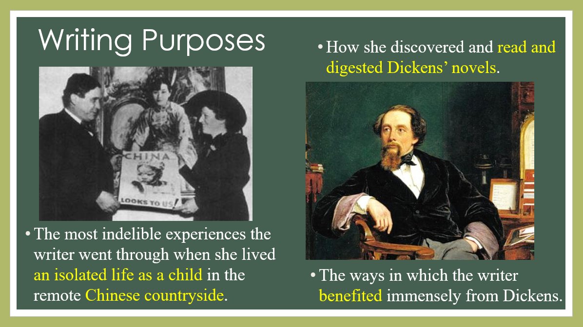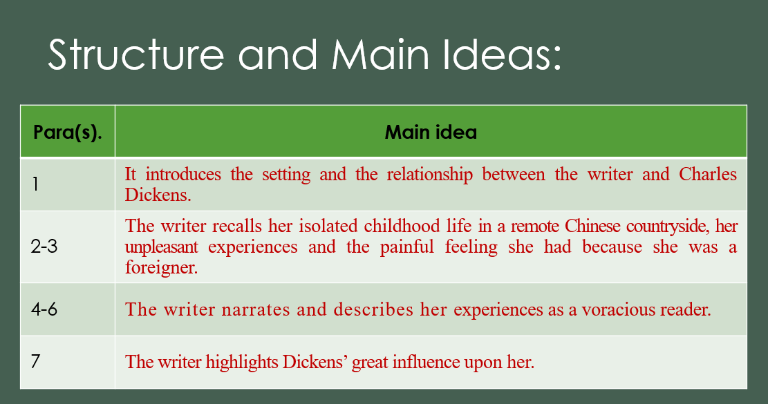 1st. Para.: the writer makes it clear that she has owed Charles Dickens a heavy debt by reading his novels. And the only way to honor her obligation is to write down what Dickens did for her.