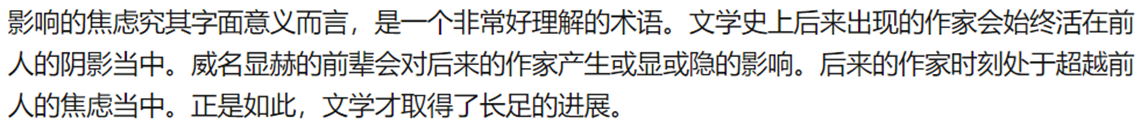 互文性阅读的产生源于一种“影响的焦虑”,即当代诗人或作家就像一个具有俄狄浦斯恋母情结的儿子,面对“诗的传统”这一父亲形象,在受前代伟人影响与压抑的焦虑中,只能采取各种有意识或无意识的“误读”方式来贬低前人或否定传统,达到树立自己形象的目的。