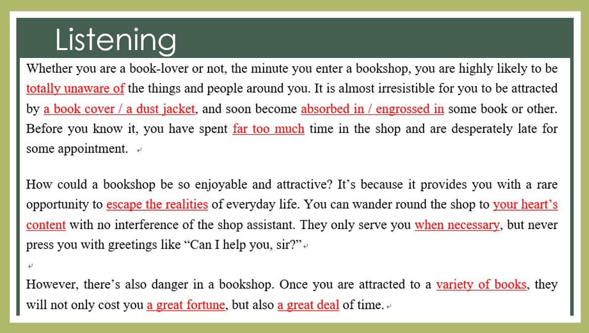 Timespent in a bookshop can be most enjoyable, whether you are a book-lover ormerely you are there to buy a book as a present. You may even have entered theshop just to find shelter from a sudden shower. Whatever the reason, you cansoon become totally unaware of your surroundings.