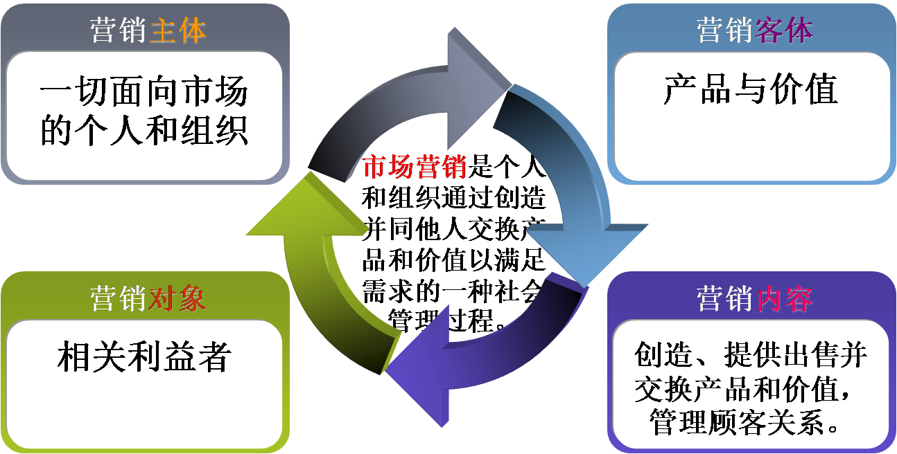 市场营销是通过对思想、货物和劳务的构想、定价、促销和渠道等方面的计划和执行,以达到个人和组织的语气目标的交换过程。