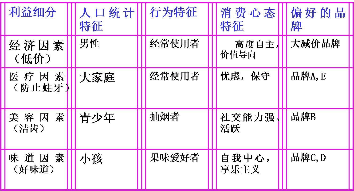 举例:牙膏市场的利益细分