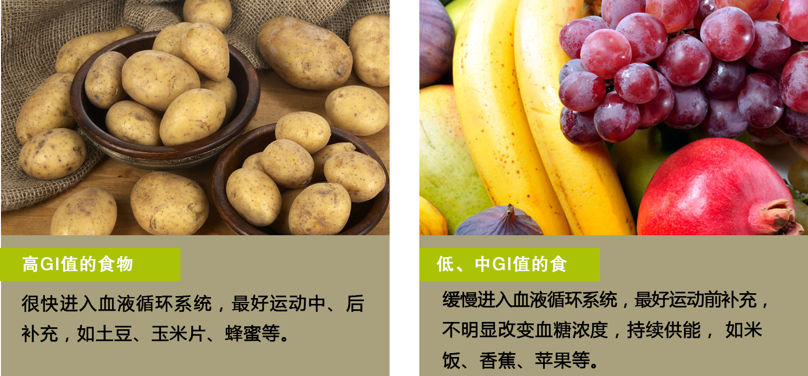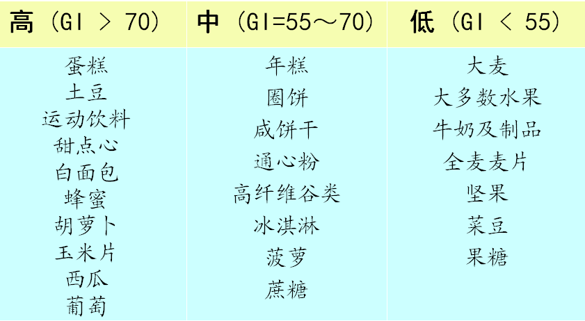 同时对于指导运动训练的补糖有意义。对于短跑的运动项目,适于选择GI值高的食物;对于耐力需要持续供能的项目,适于选择GI值低的食物。赛前、赛中也应选择不同GI值的食物。