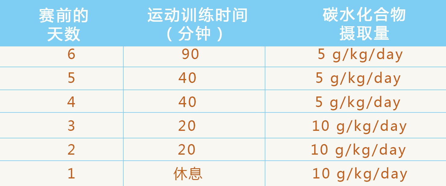 采用赛前一周逐步减小运动量,赛前一天休息,直接在赛前三天吃高糖膳食(葡萄糖?淀粉类食物?)(每日525g或8~10g/kg体重)或逐步增加膳食糖至总热量的60%~70%,并注意全面营养。但要避免食用含纤维较多的粗杂粮,以及易产气的食物。糖原负荷法主要针对耐力性、大量消耗肌糖原的运动项目使用较多。降体重和速度项目,肌糖原储备过多导致肌肉僵硬和体重增加。
