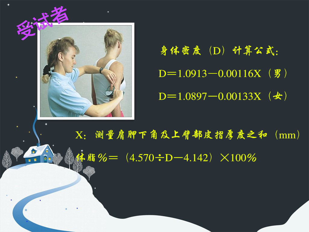 身体密度(D)=质量/体积=体重/[(体重-水下体重)÷测定水温下的密度/余气量]