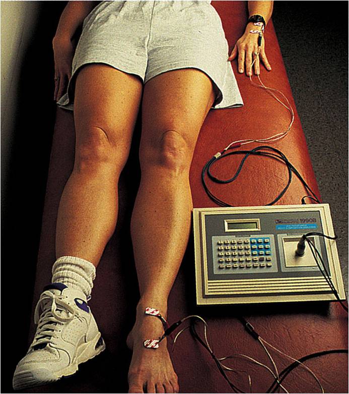测量时在腕部和踝部放置体表电极,使用无痛电流,测定身体对电流的阻抗,从而间接估算出体脂量、去脂体重及身体含水量。