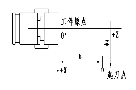 工件图样给出后,首先应找出图样上的设计基准点。其他各项尺寸均是以点为基准进行标注。该基准点称为工件原点(如下图所示,O′点即为工件原点)。以工件原点为坐标原点建立一个Z轴与X轴的直角坐标系,称为工件坐标系。如图4所示: