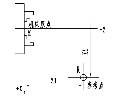 机床原点为机床上的一个固定点,车床的机床原点定义为主轴旋转中心线与主轴端面的交点。M点即为机床原点,如图3所示: